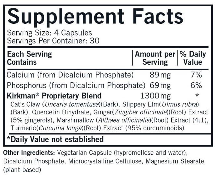 Kirkman's proprietary herbal blend to support healthy gastrointestinal mucosa and the immune system. Hypoallergenic. Gluten and casein free. Capsules are plant based. Ultra Tested®.
