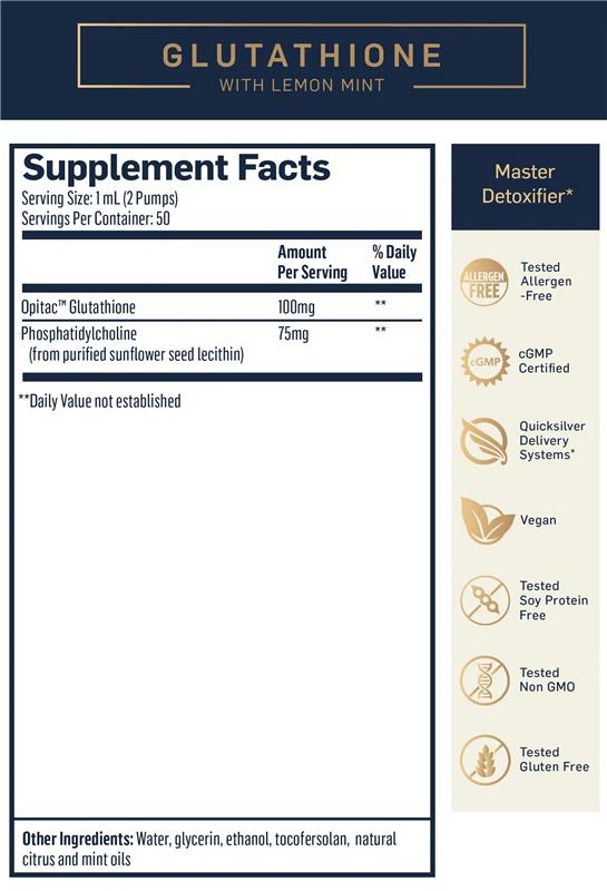 Glutathione is the body’s master detoxifier and most potent endogenous antioxidant. Glutathione offers comprehensive antioxidant protection, binding to a wide array of damaging molecules, including reactive oxygen species (ROS), lipid peroxides, xenobiotics, pesticides, mycotoxins, oxidized vitamin E, oxidized vitamin C, methylmercury, medications, heavy metals, and other harmful substances. Glutathione serves as an essential cofactor for critical and powerful antioxidant enzymes including superoxide dismutase (SOD), catalase (CAT), glutathione peroxidase (GPX), glutathione reductase (GR) and glutathione-s-transferase (GST). Glutathione has been known to help regenerate the antioxidants vitamin C and vitamin E. Glutathione offers potent protection inside the mitochondria, our cells’ energy powerhouses; is critical to our immune system function, helps dampen inflammation; is a key player in autoimmunity. Packaged in Quicksilver Scientific's advanced nano-liposomal delivery system, Quicksilver Scientific glutathione is protected from breakdown by stomach acid and delivered rapidly to the cells where it is needed most.